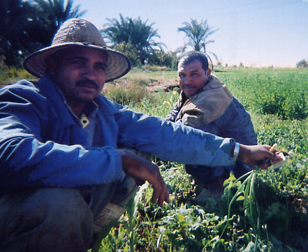 apprehensive, as I was effectively walking across private property. But all of the men I met simply welcomed me. These two asked for a cigarette, and so we sat and took a break together. They partook of the Arabic tendency to offer gifts to strangers, and tried to give me some of the crops (green onions) that they were tending to.
