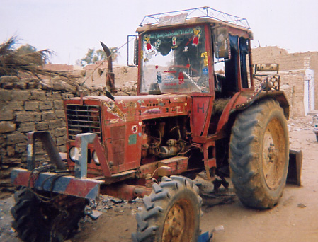 Most vehicles in Egypt are very old (20 years at least) and papered over with decals or other makeshift decoration. This tractor was almost a caricature of that phenomenon.